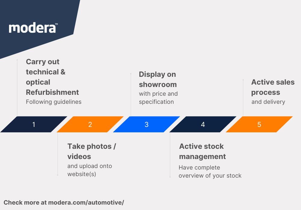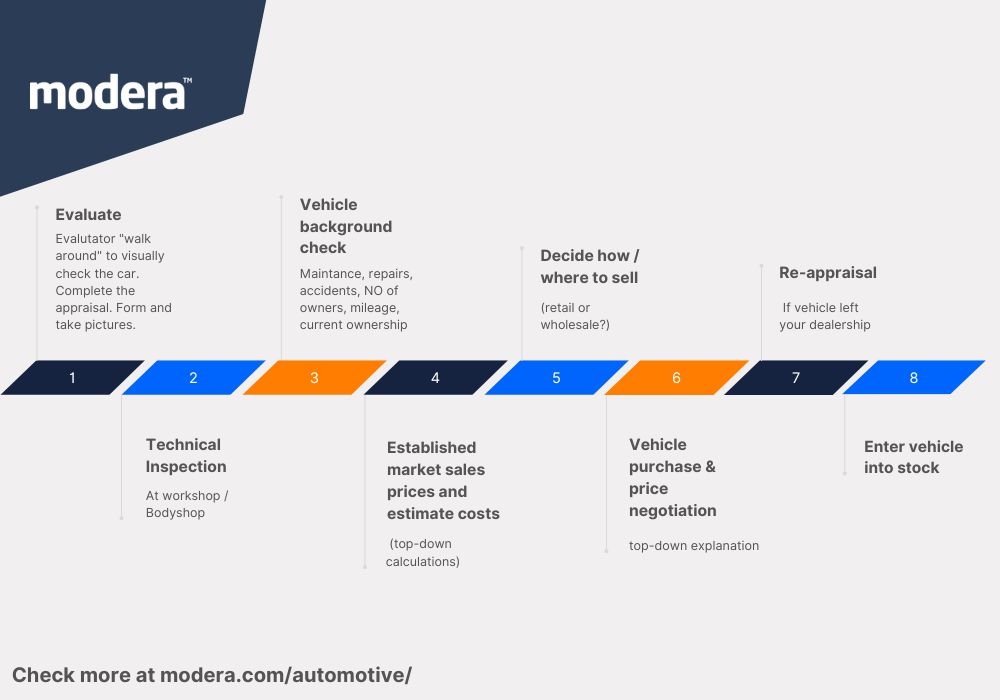 A data management platform, such as the Modera Trade-In app automates and supports the evaluation process. Trade-in app is also linked to the Modera Dealer Management System Salesfront.